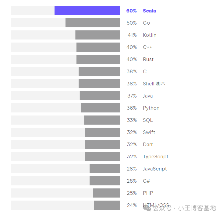 Rust 是今年唯一创下受欢迎程度新纪录的常用语言。Rust 立志以其严格的安全性和内存所有权机制取代 C++,最初可能会击败 Go,因为六分之一的 Go 用户在考虑采用 Rust。Rust 与 Scala 一样,是最少程序员想要迁出的语言。