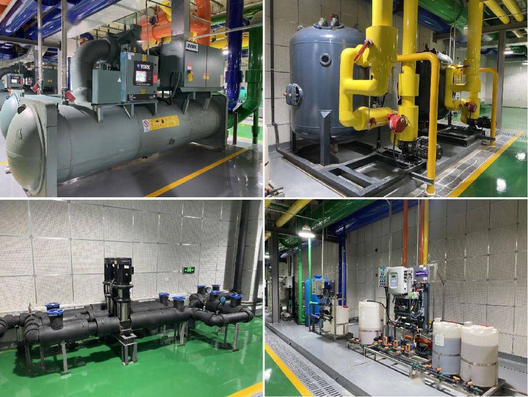 吉利科技(长兴)数据中心供冷系统采用了高效N+1冗余配置的水冷式冷水机组,设备均为国际一线品牌。冷冻水管网采用循环水设计,配备有完备的旁滤系统,除菌系统、补水系统等辅助设备,确保冷冻水系统的清洁和高效散热。