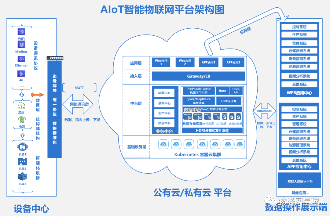边缘层是AIoT平台的最底层,主要负责收集和处理来自各种物联网设备的数据。这些设备可能包括传感器、摄像头、麦克风等,它们在边缘层通过协议和标准进行互联互通。边缘层还负责执行一些实时决策和数据处理任务,例如过滤噪音、压缩数据等。