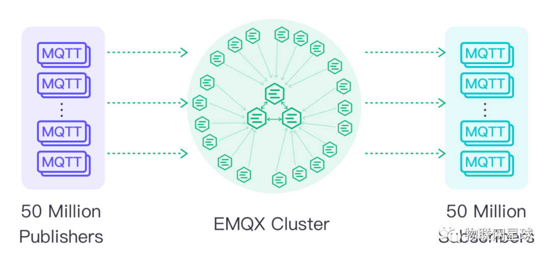 EMQX 5.0 支持全新的 Mria 集群架构,该架构极大地提高了 EMQX 的水平扩展性,使其单个集群能够轻松支持高达 1 亿个 MQTT 连接。这使得 EMQX 5.0 在全球范围内成为最具扩展性的 MQTT Broker。