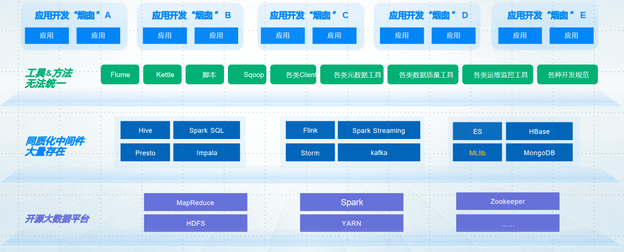但是,数据中台如果未经过系统规划,以业务为导向,不同业务选型不同的技术组件和工具,会导致数据中台建设混乱。大部分业务只使用了贴源层,在贴源层上烟囱式建设,造成数据烟囱、工具烟囱、服务烟囱,从而导致开发团队疲于应付各种技术组件的运维,和具体业务的数据模型请求,没有精力做更有价值的工作,如技术提升、共性数据模型抽象、数据服务梳理、应用开发等。