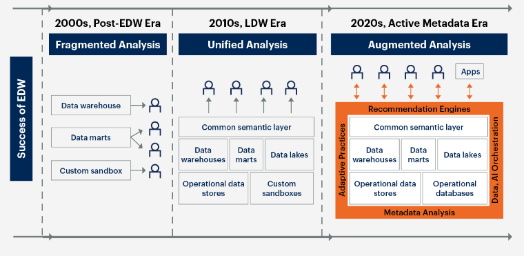 数据访问和自助分析的广泛化正在推动当前从LDW时代向主动元数据时代的演变。首席数据和分析官(CDAO)同样希望将数据用例扩展到LDW无法处理的范围。其中包括主数据管理、企业间数据共享、B2B数据集成、合作伙伴数据共享、应用程序数据集成等。