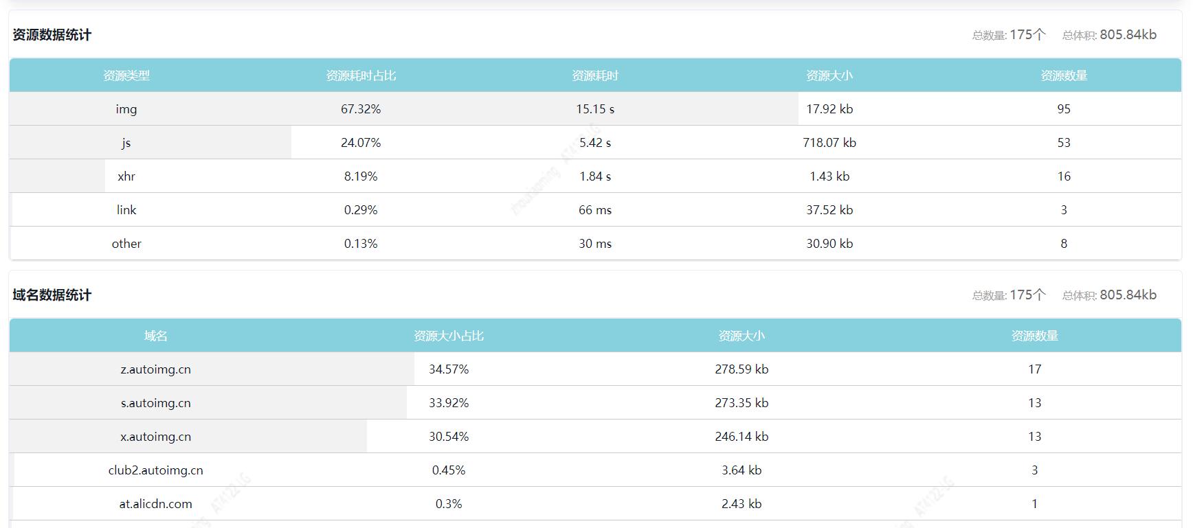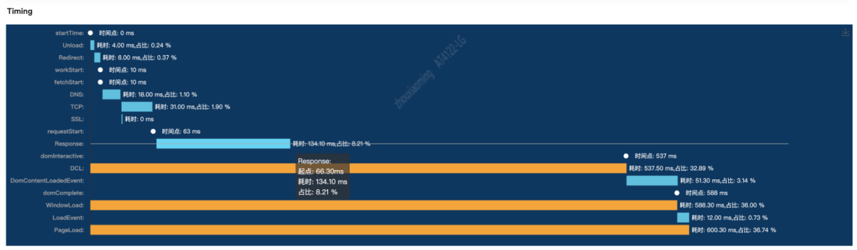 • 数据丰富,指标全面。即包含各阶段耗时,如:Unload、Redirect、DNS、TCP、SSL、Response、DomContentLoadedEvent 和 LoadEvent;还支持显示页面运行到各节点时的耗时,如:workStart、fetchStart、requestStart、domInteractive 和 domComplate;也可以根据所给节点值,计算 DCL ( DomContentLoaded ) 、window.load 事件或者 PageLoad(页面加载)的耗时。