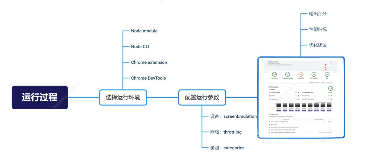指在通过仿真环境运行页面,评估页面性能。早期代表工具有我们熟知的 YSlow 和 PageSpeed。随着技术进步,当前三个最成熟的 SYN 工具为:Lighthouse、WebPageTest 和 SiteSpeed。Lighthouse 虽然仅支持 Chrome 浏览器、实施成本较高,但是有谷歌支持、易扩展、指标丰富、有评分诸多优势,已逐步代替 WebPageTest,成为 SYN 首选工具。 如下以 Lighthouse 为例介绍 SYN 的运行过程、优缺点。