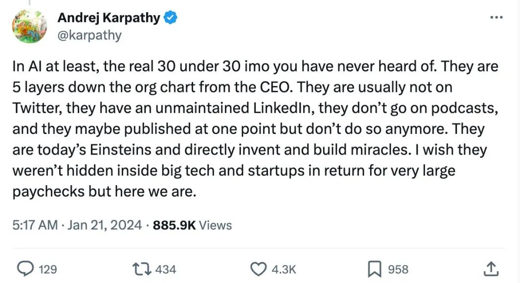 在人工智能领域,我认为你数不出来 30 个 30 岁以下的闻名者。在公司结构图里,他们在 CEO 的 5 层之下。他们通常不上 Twitter,他们的 LinkedIn 没有维护,他们不上播客,他们可能曾经发表过文章,但现在不再发表。他们是今天的爱因斯坦,直接发明和创造奇迹。我希望他们不被隐藏在大科技公司和初创公司里,以换取丰厚的薪水,但事实就是如此。
