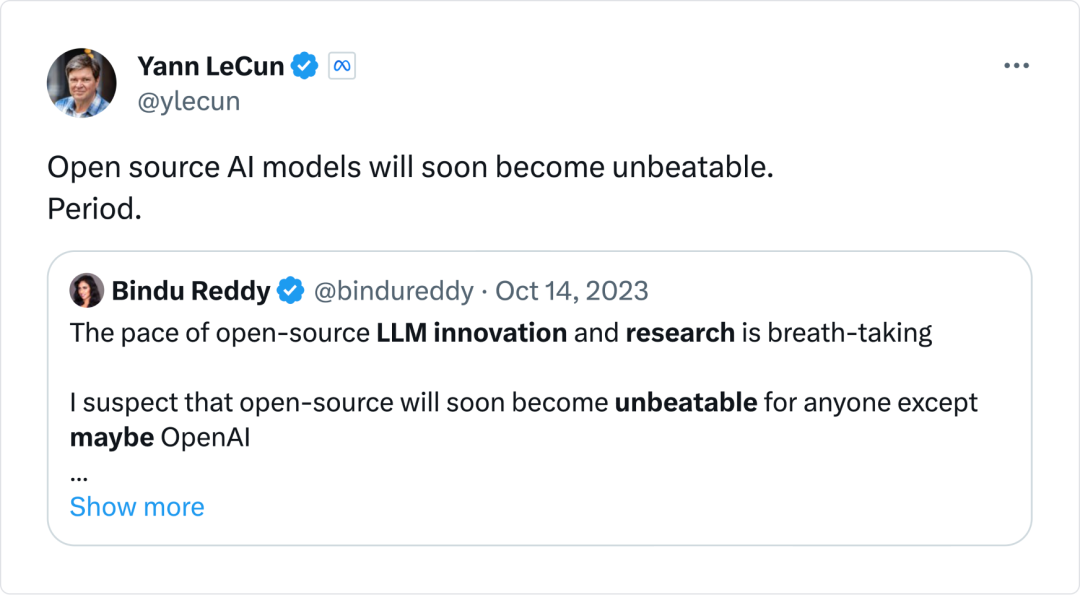 开源 AI 技术的数量和质量的不断增强,为开发人员和初创企业提供了与专有技术的大公司竞争的实力。Mixtral 8x7B 在聊天对话以及整体性能方面均优于闭源的 GPT 3.5。其他模型如 Llama、Yi 也不遑多让。