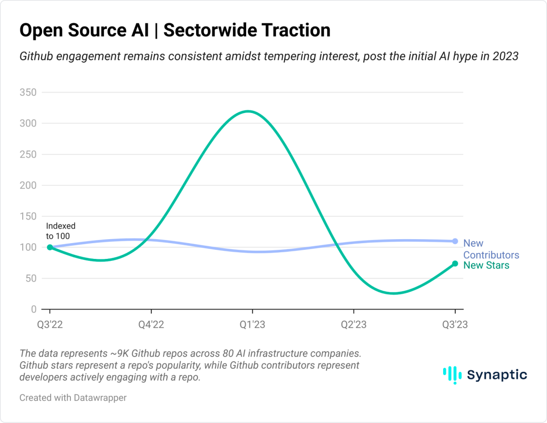 因此,开源 AI 吸引了来自开发人员、研究人员和投资者的极大兴趣。2023 年,Github 见证了开发者对生成式 AI 项目的贡献同比增长了 148%。过去 2 年,开源 AI 领域接收的投资超过 80 亿美元。