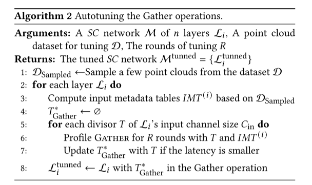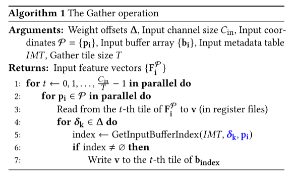 本文提出了一种新颖的分段排序双遍历二分搜索算法来在 SC 中构建内核映射。本文提出的算法高度利用了 GPU 的 on-chip 内存层次结构。本文还在 Gather 和 Scatter 操作中动态选择性能最佳的 tile 大小,并在对 GEMM 操作进行聚合(group)之前重新排序,以最大程度地减少不必要的数据访问和计算。