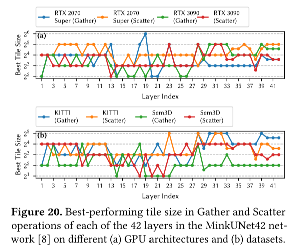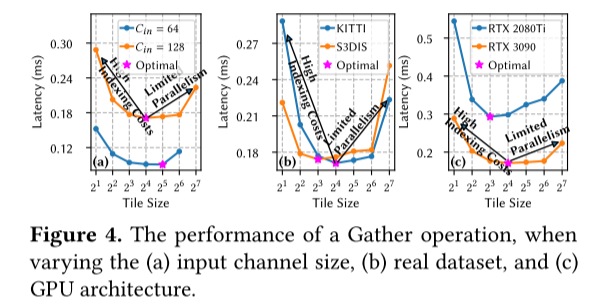 在这项工作中,本文使用各种点云网络、真实数据集和 GPU 架构来描述现有 SC 引擎 [8,9,43],并发现它们存在三个关键缺点。首先,他们使用哈希表(例如,cuckoo 哈希表 [1])来构建内核映射,其中存储必要的 GEMM 操作。然而,在哈希表中执行大量查询会导致不规则的数据访问,其中大部分由昂贵的GPU全局内存来服务,从而导致较高的数据访问成本。其次,最先进的 SC 引擎在 Gather 和 Scatter 操作中将 在 tiles 中的 SC 的多个输入/输出特征通道处理为一组连续的特征通道,以提高 GPU 内存吞吐量。然而,本文观察到他们总是采用单一的固定 tile 大小,这会导致性能不佳。在图 4 中,本文证明了性能最佳的 tile 大小取决于点云网络的每个特定 SC 层、真实数据集和 GPU 架构的特征。第三,在 GMaS 步骤中,现有的SC引擎执行与批处理方案中的多个权重偏移相对应的GEMM操作:它们通过用零值填充GEMM操作数将多个GEMM操作聚合在一起,即,它们在所有GEMM操作数中提供相同的大小,并且将它们作为单个批处理 GEMM 内核执行。通过这种方式,他们可以最大限度地减少 GPU 内核启动开销并提高 GPU 硬件利用率 [43]。然而,本文发现先前的 SC 引擎在 GMaS 步骤中按照 Map 步骤产生的顺序(即权重偏移的顺序)将 GEMM 操作聚合。这种方法会导致高填充开销(第3节),即添加大量零值,从而产生许多冗余数据访问和计算。