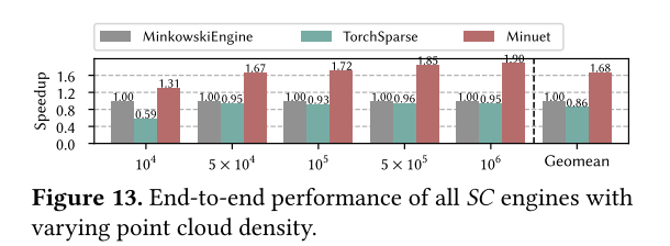 本文使用各种 3D 点云网络、真实数据集和 GPU 架构对 Minuet 进行了广泛评估,并证明 Minuet 显着优于之前的作品。与最先进的 SC 引擎相比,Minuet 的端到端性能平均提高了 1.74 倍(最高 2.22 倍),并且在 Map 步骤比之前的 SC 引擎实现了平均 15.8 倍的卓越加速(最高 26.8倍),在 GMaS 步骤中平均提高 1.39倍(最高 2.38倍)。