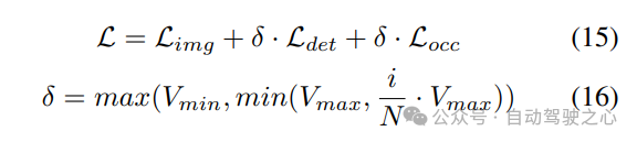 渐进式loss weight调整策略。在实践中,发现直接结合上述损失往往会导致训练过程失败,网络无法收敛。在训练的早期阶段,体素特征Fvoxel是随机分布的,并且占用头和检测头中的监督比收敛中的其他损失贡献更小。同时,检测任务中的分类损失Lcls等损失项目非常大,并且在训练过程中占主导地位,使得模型难以优化。为了克服这一问题,提出了渐进式损失权重调整策略来动态调整损失权重。具体而言,将控制参数δ添加到非图像级损失(即占用损失和检测损失)中,以调整不同训练周期中的损失权重。控制权重δ在开始时被设置为较小的值Vmin,并在N个训练时期中逐渐增加到Vmax: