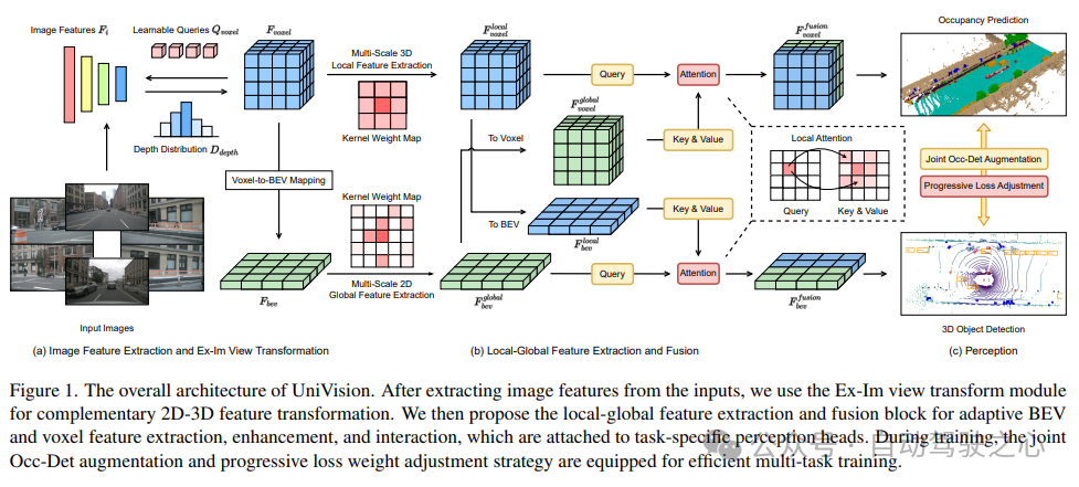 图1显示了UniVision框架的总体架构。给定来自周围N个相机的多视角图像作为输入,首先利用图像特征提取网络从中提取图像特征。然后,使用Ex-Im视图变换模块将2D图像特征提升为3D体素特征,该模块结合了深度引导的显式特征提升和查询引导的隐式特征采样。体素特征被发送到局部全局特征提取和融合block,以分别提取局部上下文感知体素特征和全局上下文感知BEV特征。然后使用交叉表示特征交互模块对用于不同下游感知任务的体素特征和BEV特征进行信息交换。在训练过程中,联合Occ-Det数据增强和渐进loss weight调整策略用于UniVision框架的有效训练。