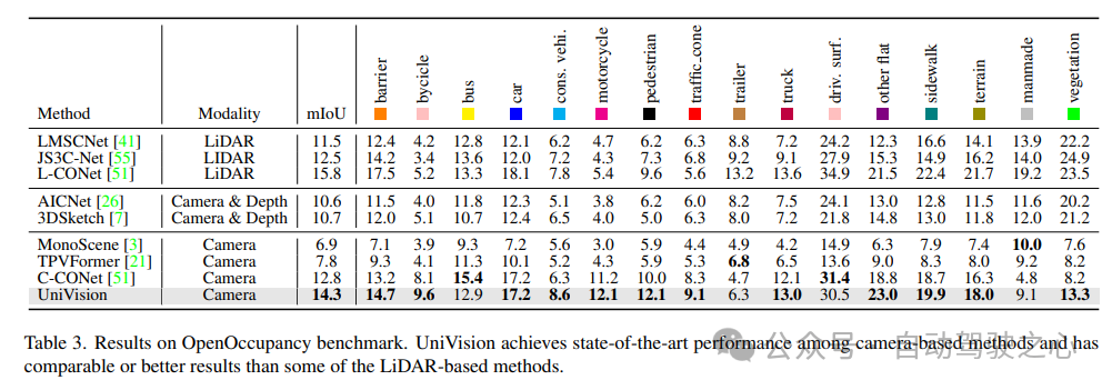 OpenOccupancy基准测试的结果如表3所示。UniVision在mIoU方面分别显著超过了最近的基于视觉的占用方法,包括MonoScene、TPVFormer和C-CONet,分别为7.3%、6.5%和1.5%。此外,UniVision超越了一些基于激光雷达的方法,如LMSCNet和JS3C-Net。