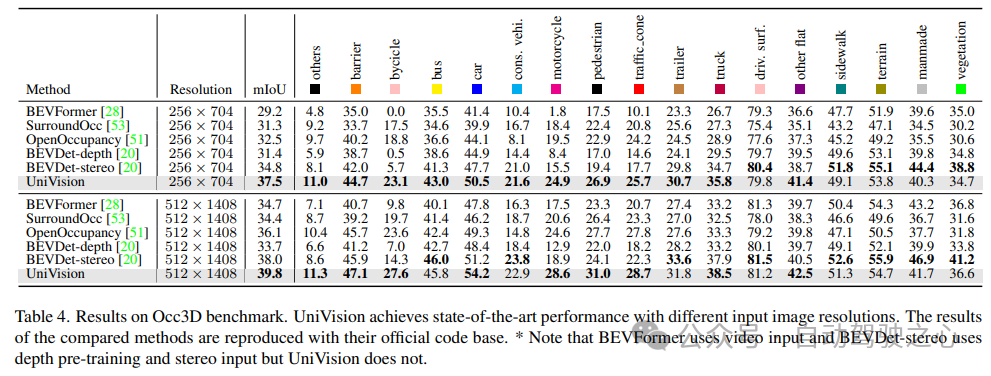 表4列出了Occ3D基准测试的结果。在不同的输入图像分辨率下,UniVision在mIoU方面显著优于最近的基于视觉的方法,分别超过2.7%和1.8%。值得注意的是,BEVFormer和BEVDet-stereo加载预先训练的权重,并在推理中使用时间输入,而UniVision没有使用它们,但仍然实现了更好的性能。