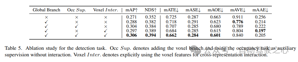 在表5中显示了检测任务的消融研究。当将基于BEV的全局特征提取分支插入基线模型时,性能提高了1.7%mAP和3.0%NDS。当将基于体素的占用任务作为辅助任务添加到检测器时,该模型的mAP增益提高了1.6%。当从体素特征中明确引入交叉表示交互时,该模型实现了最佳性能,与基线相比,mAP和NDS分别提高了3.5%和4.2%;