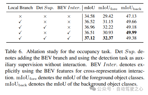 在表6中显示了占用任务的消融研究。基于体素的局部特征提取网络为基线模型带来了1.96%mIoU增益的改进。当检测任务被引入作为辅助监督信号时,模型性能提高了0.4%mIoU。