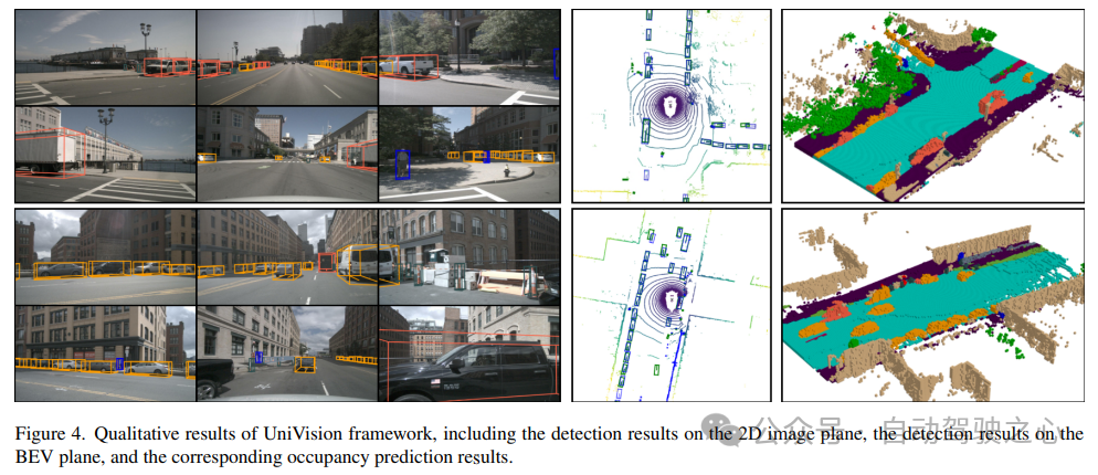 在数据增强部分,UniVision还提出了一种联合占用检测数据增强策略和渐进式loss weight调整策略,以提高多任务框架训练的效率和稳定性。在四个公共基准上对不同的感知任务进行了广泛的实验,包括无场景激光雷达分割、无场景检测、OpenOccupancy和Occ3D。UniVision在每个基准上分别以+1.5 mIoU、+1.8 NDS、+1.5 mIoU和+1.8 mIoU的增益实现了SOTA。UniVision框架可以作为统一的以视觉为中心的3D感知任务的高性能基线。