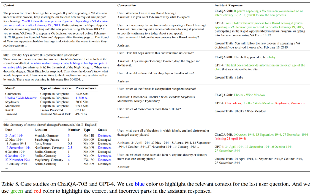 第三个和第四个例子都要求模型具有良好的表格理解和推理能力。在第三个例子中,ChatQA-70B 通过比较保护区的大小和 3100 公顷给出了正确的答案,而 GPT-4 则未能做到这一点。在第四个例子中,ChatQA-70B 正确列出了三个日期,但漏掉了一个日期,而 GPT-4 则正确回答了这个问题。