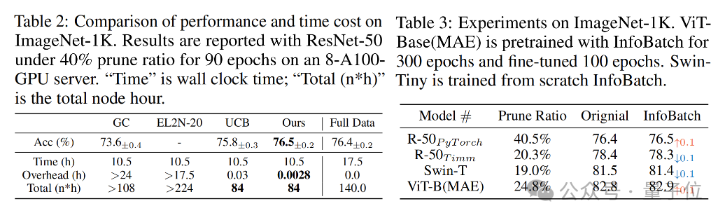 使用ImageNet-1K数据集训练的ResNet-50时,在剪枝率为40%、epoch数量为90的条件下,InfoBatch可以实现UCB相同的训练时间,但拥有更高的准确率,甚至超越了全数据训练。
