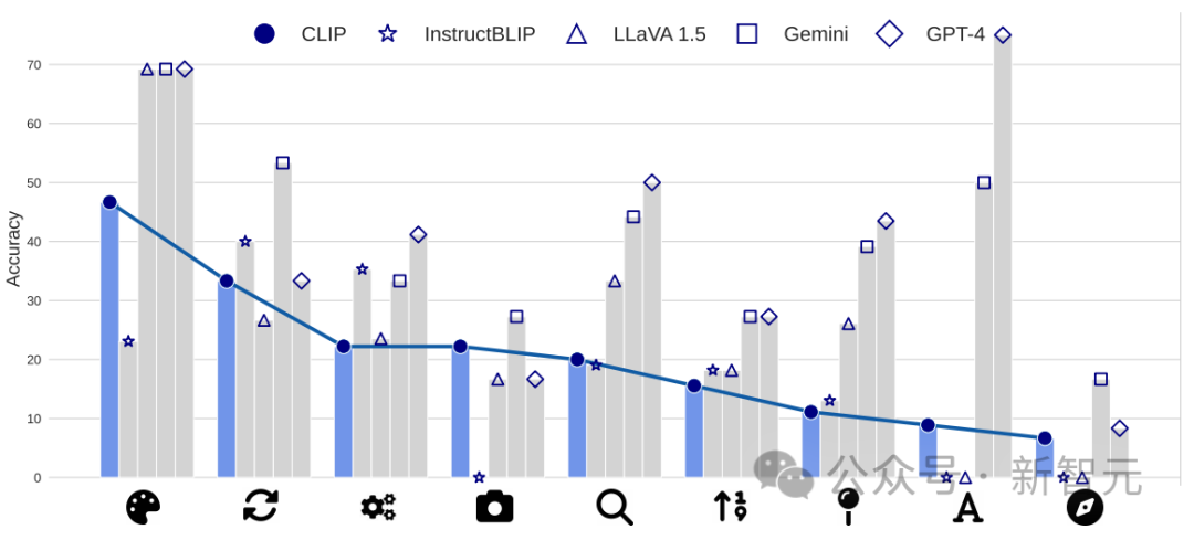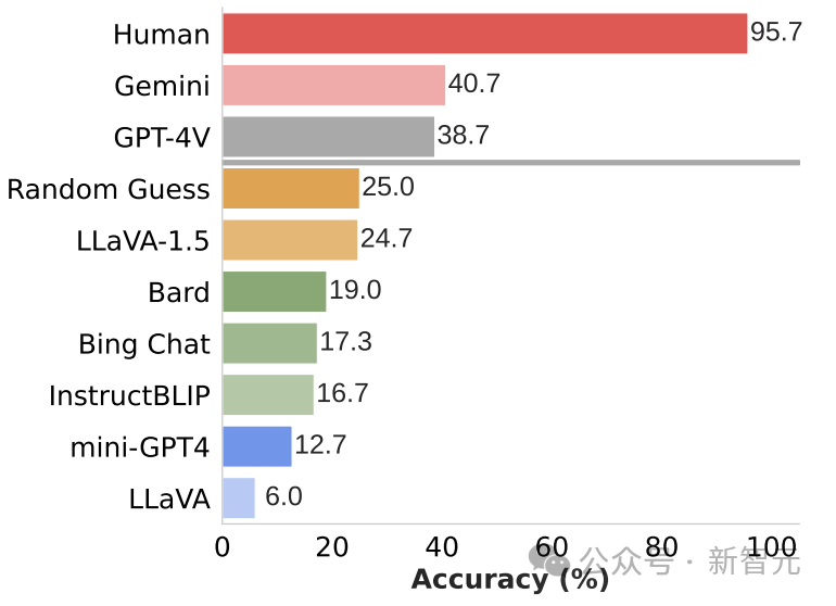 除GPT-4V和Gemini之外的模型得分都低于随机猜测水平(25%)。最先进的GPT-4V和Gemini在解决这类基本视觉基础问题上表现也很不理想。