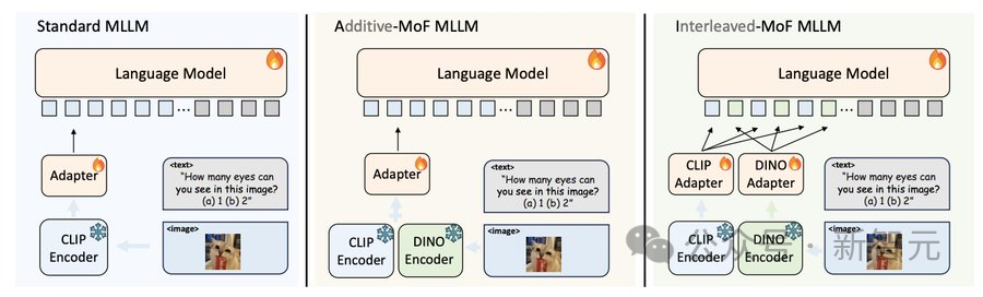 在大语言模型中采用不同的特征混合(MoF)策略。左图:标准的大语言模型采用现成的CLIP预训练视觉编码器;中图:加性特征混合(A-MoF)大语言模型:在适配器前将CLIP和DINOv2特征进行线性混合;右图:交错特征混合(I-MoF MLLM)在适配器后将CLIP视觉Token和DINOv2视觉Token进行空间交错。