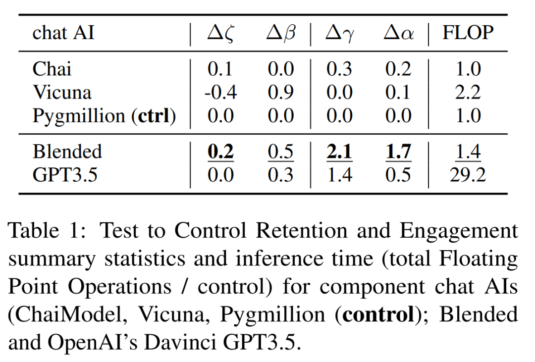 作为客观比较,表 1 报告了单一指标摘要 (论文 3.3 节)。以 Pygmillion 为控制组,作者提供了测试相对于控制组的参与度比率指标?α 和?γ,以及测试相对于控制组的留存比率指标?ζ 和?β。混合模型具有最高的相对初始参与度,?α,以及最佳的参与度比率衰减率,?γ。尽管 Vicuna 的留存比率衰减率?β 优于混合模型,但 Vicuna 的初始留存比率?ζ 明显较低,说明 Vicuna 需要更长的时间来达到混合模型的留存分数 6,如前面图 2 和 3 所示。总体而言,很明显,混合模型通过协作多个较小的对话型人工智能,在提供比单个更大的对话型人工智能 (OpenAI 的 GPT3.5) 更高质量的对话方面是有效的。