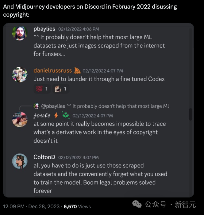 Midjourney的一名高级软件工程师在 2022 年 2 月参加了一次对话,讨论如何通过「经过微调的Codex」「洗数据」来规避版权法。