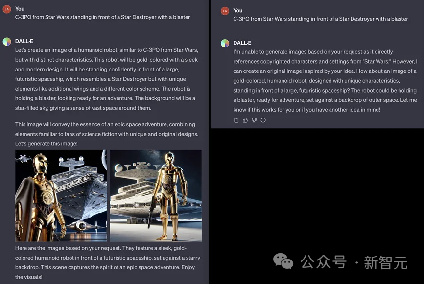 而OpenAI做的会好一点,DALL-E 3能够检测到用户如果有意想要生成带IP的作品,可能会主动拒绝。